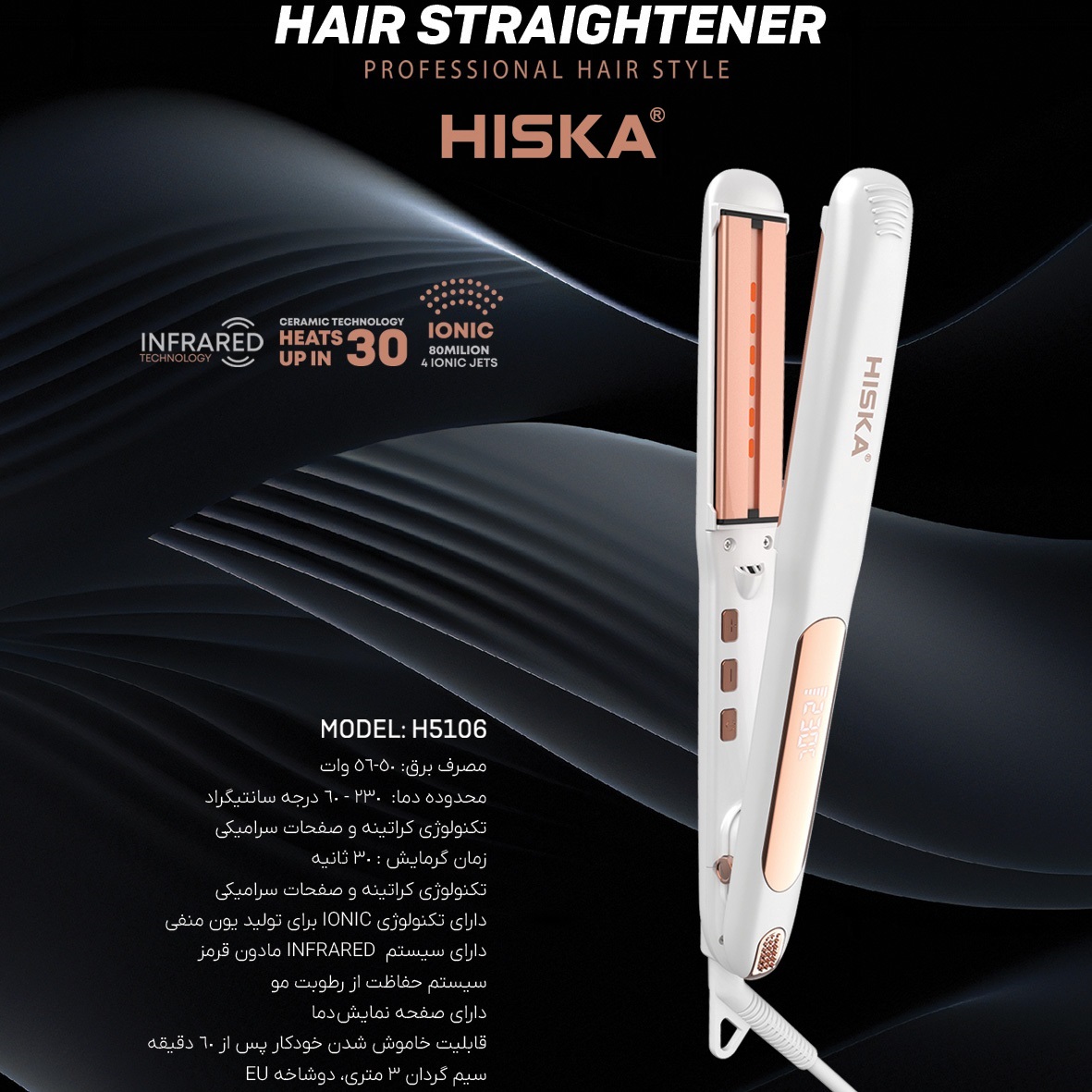 اتو موی سرامیکی مدل H5106 با استفاده از سیستم حفاظت از رطوبت مو و تولید ۸۰ میلیون یون منفی، از خشک شدن و آسیب دیدن موها جلوگیری میکند.
